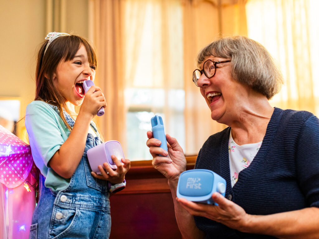 Ya sea cantando vuestras canciones favoritas, recitando un poema, contando chistes o creando historias y cuentos, toda la familia puede intervenir, pasando el micrófono y añadiendo su toque de magia personal ¿Qué increible historia viene ahora con myFirst Voice 2?