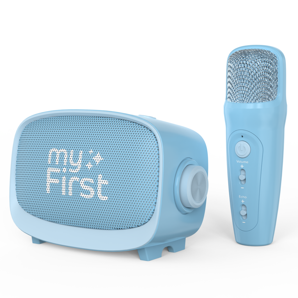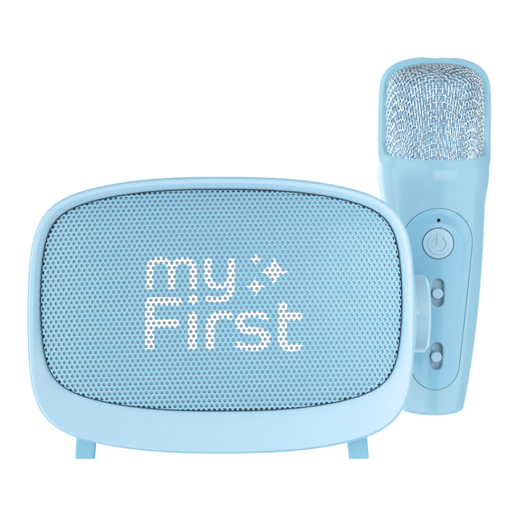 myFirst Voice 2 es un set de karaoke que puedes conectar por Bluetooth, tarjeta de memoria o entrada AUX para compartir e interactuar con tus audios, canciones y audiolibros o utilizarlo solo con el micrófono para recitar tus ideas ¡y que las escuche todo el mundo!
