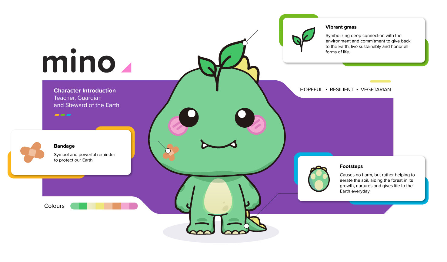 Su vibrante color verde se mezclaba perfectamente con el follaje, y su cuerpo robusto pero gentil se movía a través del bosque con una gracia tranquila, un testimonio viviente de adaptación y supervivencia. De apariencia distintiva, mino llevaba una venda en la cara, un conmovedor recordatorio de las cicatrices dejadas por la contaminación y el abandono ambiental. Este vendaje sirvió como un recordatorio constante para mino de la importancia de proteger la Tierra. Encima de su cabeza había un trozo de hierba vibrante que florecía como si sus propios pensamientos estuvieran arraigados en la naturaleza misma. Esta corona viviente simbolizaba su profunda conexión con el medio ambiente y su compromiso inquebrantable de retribuir a la Tierra que lo crió. A pesar de su timidez, las acciones de mino lo decían todo. Mientras deambulaba por el bosque, plantaba semillas y cuidaba árboles jóvenes, y sus pesados pasos ayudaban a la aireación del suelo y promovían el crecimiento.